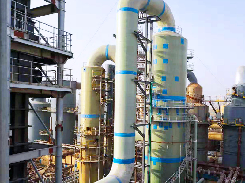 玻璃钢脱硫塔工流程:首先,热烟气进入预洗涤塔,与饱和硫酸铵溶液接触,烟气在此过程中被冷却,同时,由于饱和硫酸铵溶液中水的蒸发而析出硫酸铵晶体。已被冷却的烟气通过除雾器进入SO2吸收塔。在吸收塔中,氨与水混合成氨液。烟气中的SO2在此被吸收,与氨反应生成硫酸铵。最后,脱硫后烟气经120米高的烟囱排入大气。硫酸铵溶液被送入预洗涤塔循环利用。预洗涤塔中的硫酸铵料浆进入脱水系统。先经水利旋流器脱水,然后经离心机得到硫酸铵滤饼。从旋流器和离心机回收的清液返回预洗涤器,循环利用。硫酸铵滤饼被送至造粒系统,得到高利用价值的颗粒硫酸铵肥料,在被火车或者卡车运走前,存放在能容纳50,000吨硫酸铵的圆顶储仓内。
