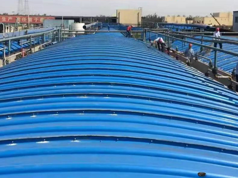 大跨距污水池加盖(污水池罩子,污水池盖板)根据基础的形状分为圆形、方形,也可根据盖子的平面状态分为:平面型和立体型,产品可以覆盖直径40米以下的圆池和跨距20米以内的矩形池。公司为客户提供工程设计书、工程3D效果图、现场安装等一整套服务,产品具备优异的耐侯、轻质高强、美观等性能,是国内外污水处理行业、化工行业加罩、除臭的首先材料。